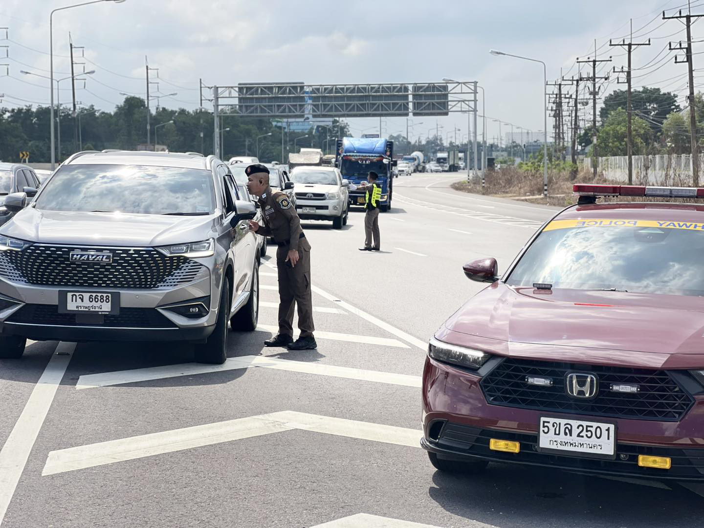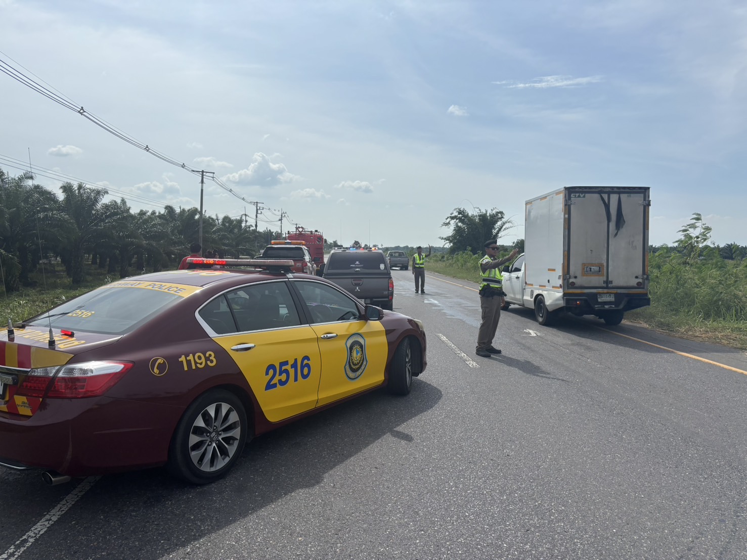 พ.ต.ต.ปานเทพ พจน์ธีระมนตรี สว.ส.ทล.5 กก.2 บก.ทล. พร้อมเจ้าหน้าที่ตำรวจทางหลวงสุราษฎร์ธานี อำนวยความส